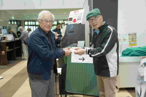 | <受付> 1番スタートが7時35分と、集合時刻が早まり6時45分からの受付になりました。恒例のお楽しみ抽選会では、北足立南支部の松原誠様が、早々にキャディーバッグを引き当てました。おめでとうございます。 また、今年度も比企支部の飯島留一様に参加いただき、参加最高年齢が92歳に更新されました。飯島様には、本会の新井俊一会長から「最高年齢者特別賞」が渡されました。今年度は、当日の欠席が3名あり120名での開催になりました。 ※詳しくは、「組み合わせ・スタート時刻」「参加状況」をご覧ください。